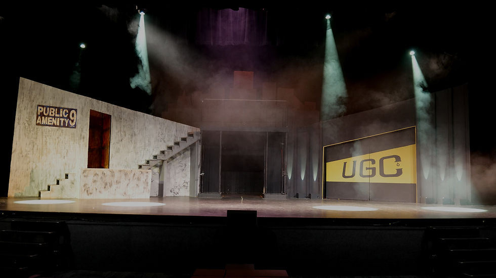 One of the primary concepts for the design was to emphasize the dreadfulness of this universe. The poor needed to be miserable and in disrepair while the rich needed to be illustrious yet filthy. One of the ways we achieved this was through the use of contrast. The UGC building is sleek and sharp, drawing inspiration from the likes of Trump Tower in NYC. The UGC was painted with solid colors of black, grey and gold. All the lines are straight and there are no visible imperfections. This right next to the gross Amenity, which was painted with sponges, spray bottles and textured with putty, creates a very stark visual contrast when switching between the two focal points. At the center, there was a basic elevated platform, utilized primarily by the cops in the show. This platform was created specifically with authority in mind. There is always someone watching you and there is always someone above you when you’re in Urinetown; an eerie reflection of our world.